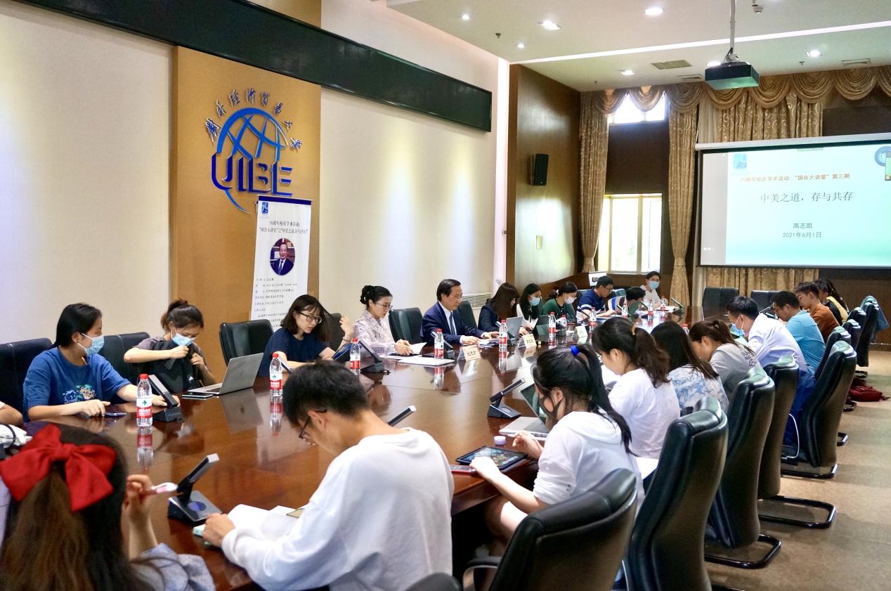 2021年6月1日下午,对外经济贸易大学70周年校庆学术活动:“国合大讲堂”第三期在行政楼会议室成功举办,并在腾讯会议线上同步直播。中国与全球化智库副主任高志凯博士应邀为到场师生做题为“中美之道,存与共存”的讲座。beat365英国官方网站院长金旭、副院长沈思言、副院长肖慧琳、办公室主任杜纪庆出席此次讲座,40余名师生到场参加。本次讲座由肖慧琳副院长主持。
